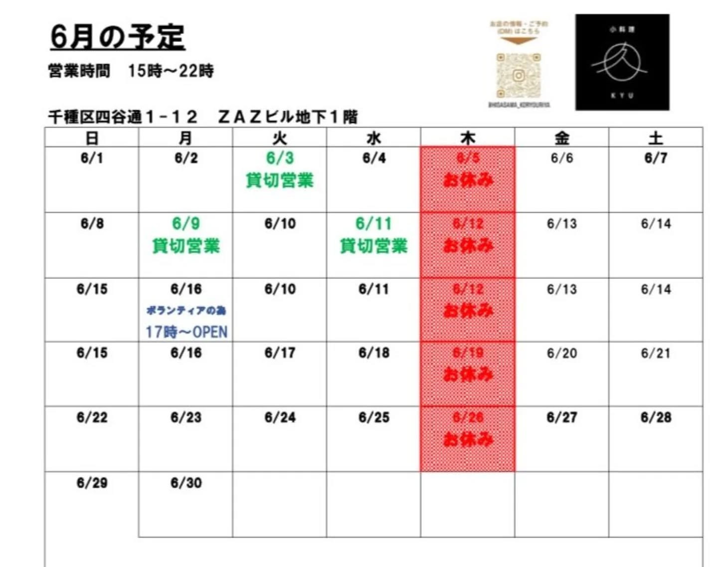 6月営業予定表です