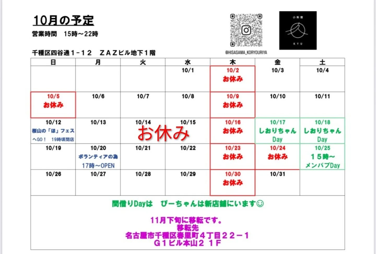 10月営業予定変更