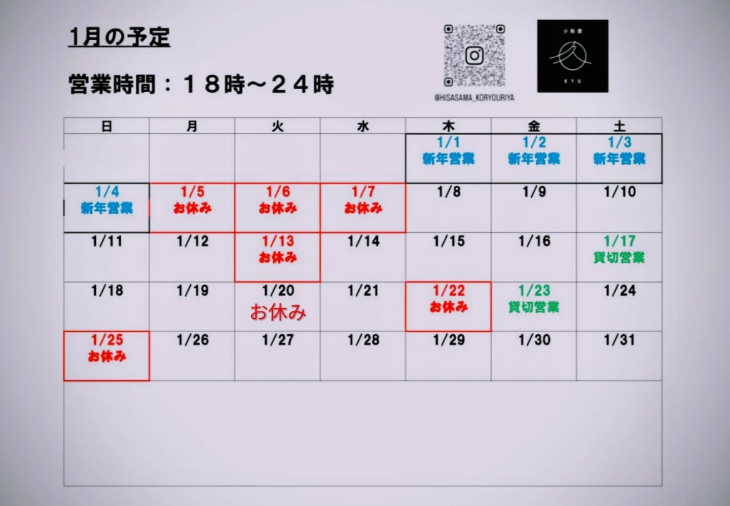 1月営業予定変更