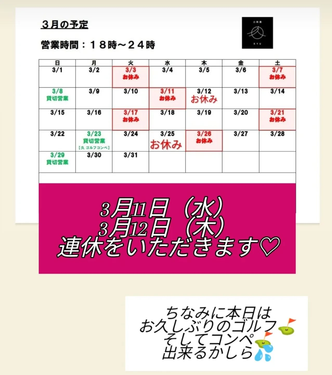 3月11日と12日はお休みです