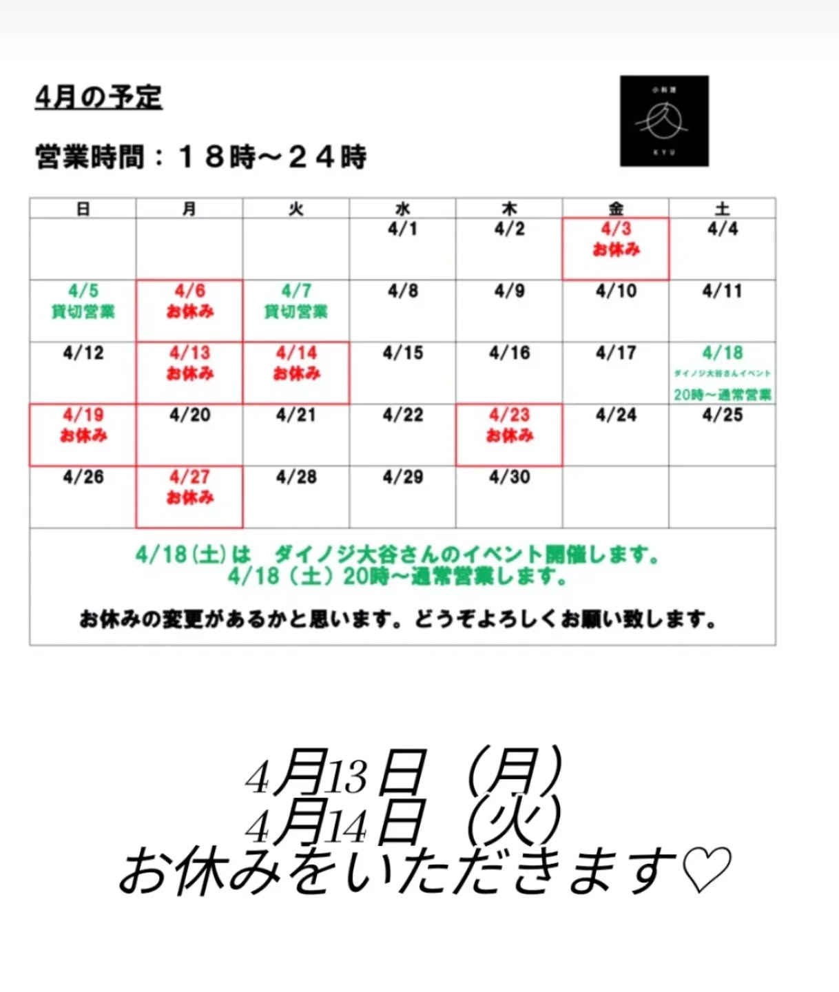 4月13日(月)14日(火)